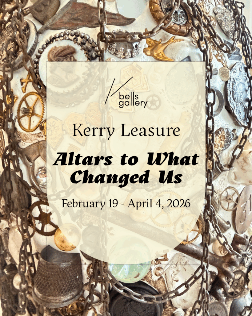 The Bells Gallery is thrilled to announce artist Kerry Leasure’s first solo gallery exhibition, Altars to What Changed Us on view from February 19 – April 4, 2026. In Kerry Leasure’s everyday art practice, she uses found objects to shape wearable art. However, this exhibition is an extension of her regular wearables practice into exploring objects and meaning, by scaling her work with found items, and playing into her admiration for the folk art tradition of Memory Jugs.